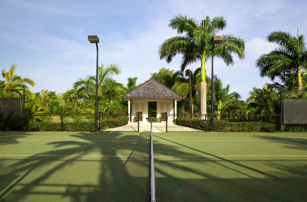 Amenities include indoor/outdoor living spaces, heated infinity private pool, Extensive outdoor spaces for lounging and wandering, Three al fresco dining areas, Outdoor bar, Fitness Center, Tennis court, Family/ game room with TV and foosball, Office with sea views, High-speed wireless Internet access, golf carts for guest use, bicycles for guest use, one rollaway or one crib